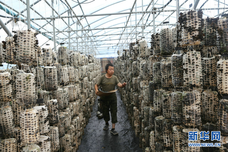 8月6日,劉振義在大棚里查看木耳生長情況。新華網(wǎng)曹楨攝