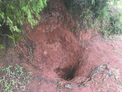 順著吳大爺?shù)闹敢?,記者穿過(guò)一片蘆葦?shù)?,整條山路雜草叢生,無(wú)路可尋。在山頂?shù)囊豢冒貥?shù)下,記者找到了尸體被埋處,一個(gè)約半米深、寬半米的泥坑,樹(shù)根裸露在外,周圍新翻的泥土掩蓋了雜草。現(xiàn)場(chǎng)還有警方取證時(shí)留下使用過(guò)的一次性手套。