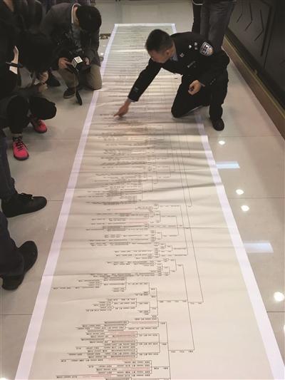 當(dāng)時公安信息化不是很發(fā)達(dá),家譜上的姓名和公安機(jī)關(guān)戶籍系統(tǒng)中的姓名有出入。民警將上千名家譜中的男性逐一翻拍,回南京后再根據(jù)翻拍的家譜照片,按照每一個人的血緣、親緣、家庭關(guān)系,逐人核對、逐人梳理。由于當(dāng)?shù)丶易宄蓡T關(guān)系非常復(fù)雜,民警足足耗時兩個多月,制作出了一份長達(dá)6.8米的家譜關(guān)系圖。