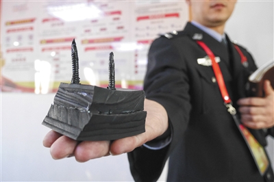 昨日,民警展示盜竊團伙用來扎汽車輪胎的作案工具“膠皮釘”。新京報記者 王嘉寧 攝
