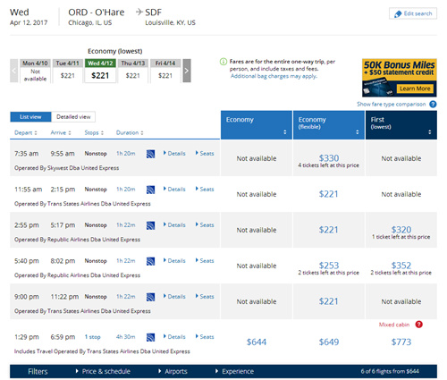 圖說(shuō):記者在美聯(lián)航官網(wǎng)搜索奧黑爾國(guó)際機(jī)場(chǎng)飛往肯塔基州路易斯維爾的航班。
