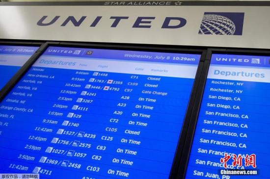 資料圖。2015年7月8日,美國(guó)聯(lián)合航空公司電腦系統(tǒng)出現(xiàn)故障,導(dǎo)致其在全美所有機(jī)場(chǎng)的航班停飛約2小時(shí)。