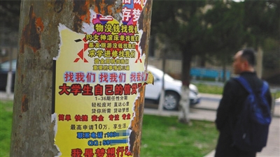 張貼在鄭州一大學校園內(nèi)的校園網(wǎng)貸廣告。新京報記者 曹曉波 攝