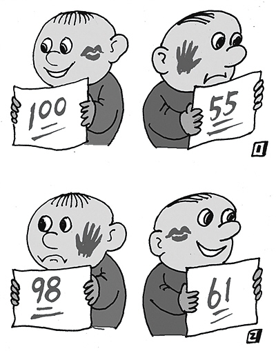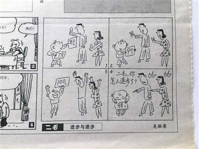 一個孩子考了100分,受到表揚。后來考了98分,結果被打了耳光;另一孩子考了55分,被打了耳光。第二次考了61分,卻受到表揚:這幅名為《進步與退步》的四格漫畫,入選為2016年高考全國卷1的作文題目。