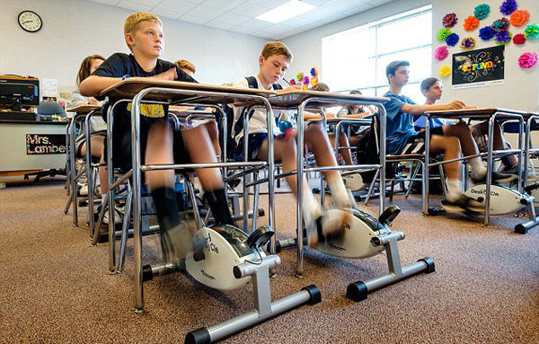 據(jù)英國(guó)《每日郵報(bào)》9月19日?qǐng)?bào)道,美國(guó)北卡羅萊納州馬丁中學(xué)的美女?dāng)?shù)學(xué)老師寶芬妮· 蘭伯特(Bethany Lambeth)在課堂上發(fā)現(xiàn)學(xué)生容易開(kāi)小差,精力不佳。為此,她決定在學(xué)生課桌下面安裝自行車(chē)腳踏板,一舉兩得。