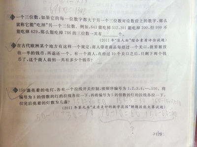 “150盞亮著的電燈,各有一個(gè)拉線開(kāi)關(guān)控制,被順序編號(hào)為1,2,3,4,…,150。將編號(hào)為3的倍數(shù)的燈的拉線各拉一下,再將編號(hào)為5的倍數(shù)的拉線各拉一下,拉完后亮著的燈數(shù)為幾盞?”這是一道考公因數(shù)和公倍數(shù)的思維數(shù)學(xué)題,今年暑假,才上完三年級(jí)的羅弋在做四年級(jí)的數(shù)學(xué)競(jìng)賽題集《培優(yōu)新幫手》時(shí)遇到此題,算出答案“90”與標(biāo)準(zhǔn)答案“80”不符,媽媽陳群只當(dāng)兒子錯(cuò)了。