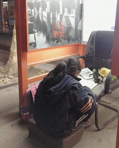 照片上這個(gè)四面漏風(fēng)的電話亭,是嘉興12歲女孩曉華的“書(shū)房”,一把舊椅子當(dāng)書(shū)桌,沙發(fā)坐墊當(dāng)?shù)首?,每天借著昏暗的照明燈看?shū)做作業(yè)。
