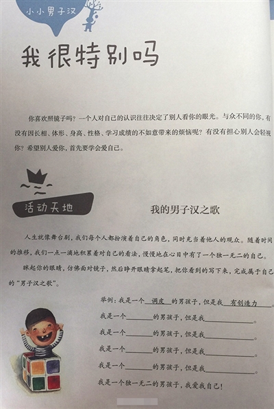 據(jù)上海教育出版社官方微信介紹,《小小男子漢》這本教材共分六個篇章。第一課“我是男孩”,主要幫助男生理解男孩和女孩究竟有哪些不同;第二課“擁抱我自己”,主要幫助男生理解什么樣的男孩算得上“酷”。第三課“好想長大”,理解“為什么男子漢要有擔待?”等。
