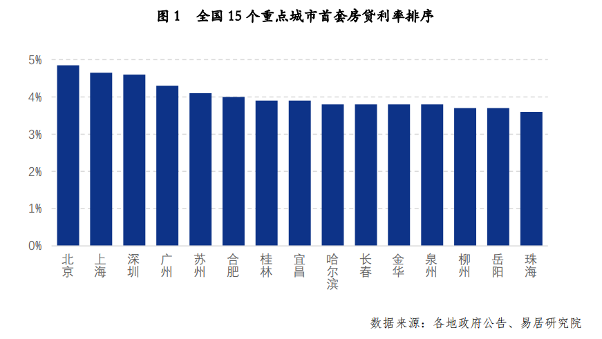 但具體看這15個(gè)城市的排序情況,各城市的實(shí)際首套房貸利率呈現(xiàn)了較大差異。其中北上深廣四個(gè)一線城市房貸利率最高,分別為4.85%、4.65%、4.60%和4.30%。而其他城市均低 4.1%的水平。易居房地產(chǎn)研究院統(tǒng)計(jì)顯示,有9個(gè)城市房貸利率低于4%的水平,包括弱二線城市和很多三四線城市。