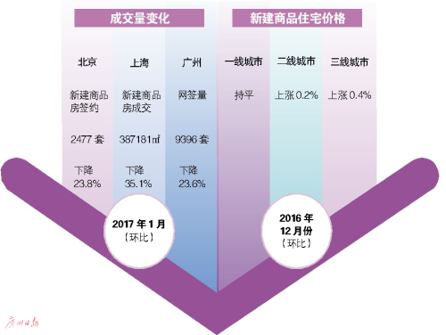 國(guó)家統(tǒng)計(jì)局70個(gè)大中城市住宅銷(xiāo)售價(jià)格統(tǒng)計(jì)數(shù)據(jù)顯示,2016年12月份有46座城市新建商品住宅價(jià)格環(huán)比上漲,2016年11月份為55座城市上漲,價(jià)格環(huán)比上漲的城市個(gè)數(shù)在減少。其中一線城市新建商品住宅價(jià)格環(huán)比由上月的上漲0.1%轉(zhuǎn)為持平;二線城市新建商品住宅價(jià)格上漲0.2%,比上月回落0.2個(gè)百分點(diǎn);三線城市新建商品住宅價(jià)格上漲0.4%,比上月回落0.4個(gè)百分點(diǎn)。15個(gè)一線和熱點(diǎn)二線城市因地制宜、因城施策實(shí)施調(diào)控政策以來(lái),政策效果明顯,房?jī)r(jià)快速趨穩(wěn)回落。其中廣州市已連續(xù)三個(gè)月環(huán)比漲幅回落。