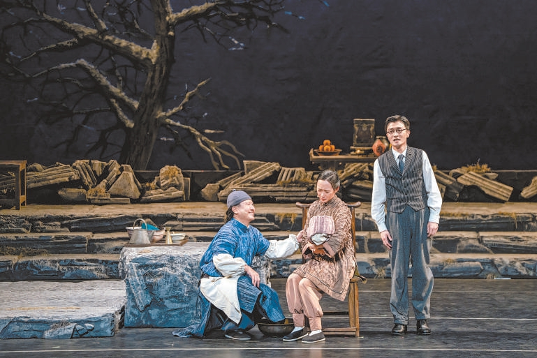 舞臺地面也由過去的雪地變成了石板地。石板形象參考了“圓明園”的石頭形制,隱喻著“石頭很頑強(qiáng),雖然被摧殘過,但是它依然在,并且會一直存在下去”。臺前幾盆老舍先生最愛的菊花,也依舊開得繁盛。