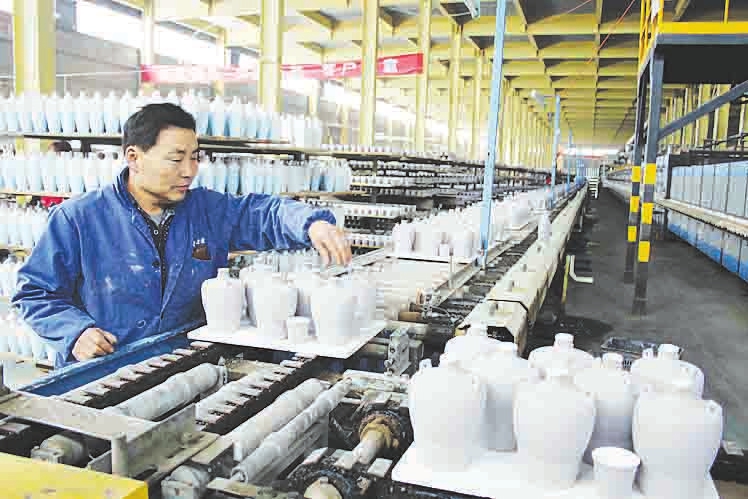 4月7日,位于陽(yáng)城縣町店鎮(zhèn)五龍溝陶瓷工業(yè)園區(qū)的晉城市晉陶陶瓷公司工人正在加緊生產(chǎn)汾酒酒瓶。今年一季度,該公司生產(chǎn)各類酒瓶酒具200萬(wàn)支,再創(chuàng)歷史同期最高水平。尹春雷 攝