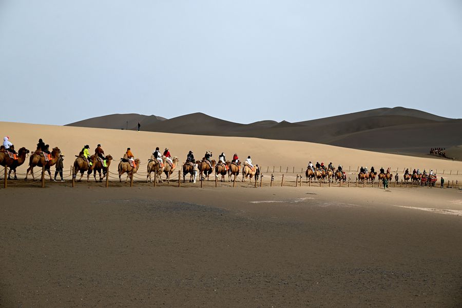 國(guó)慶、中秋雙節(jié)將至,節(jié)日氛圍日益濃厚,多地景區(qū)游客增多,旅游逐漸“升溫”。圖為9月25日,游客在甘肅省敦煌市鳴沙山月牙泉景區(qū)游覽。新華社發(fā)(張曉亮攝)