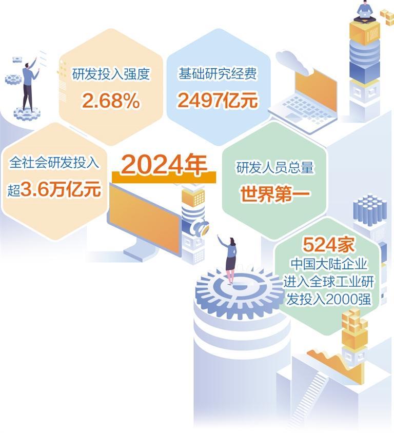科技投入持續(xù)增加。2024年全社會(huì)研發(fā)投入超3.6萬(wàn)億元,較2020年增長(zhǎng)48%;研發(fā)投入強(qiáng)度達(dá)2.68%,超過(guò)歐盟國(guó)家平均水平;研發(fā)人員總量世界第一?;A(chǔ)研究經(jīng)費(fèi)達(dá)2497億元,較2020年增長(zhǎng)超過(guò)70%,在量子科技、生命科學(xué)、物質(zhì)科學(xué)、空間科學(xué)等領(lǐng)域取得一批重大原創(chuàng)性成果,高水平國(guó)際期刊論文數(shù)量和國(guó)際專(zhuān)利申請(qǐng)量連續(xù)5年世界第一。