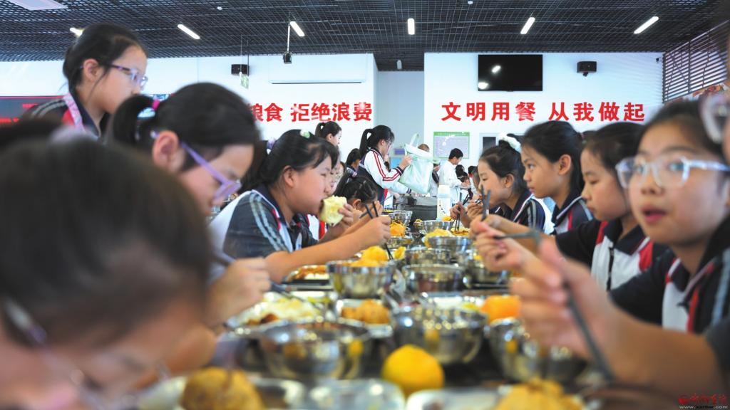 走進(jìn)長(zhǎng)城小學(xué),1535.25平方米的校內(nèi)餐廳里,900余名師生在老師引導(dǎo)下有序取餐、就餐,餐盤里葷素搭配的飯菜色香味俱全,孩子們的臉上滿是笑意?!耙郧鞍謰尮ぷ髅?,我每天得坐校車來回跑,現(xiàn)在有了午托太幸福了!午餐每天不重樣,有肉有湯,比媽媽做得還香!”六年級(jí)學(xué)生李宸慶捧著飯菜笑著說。