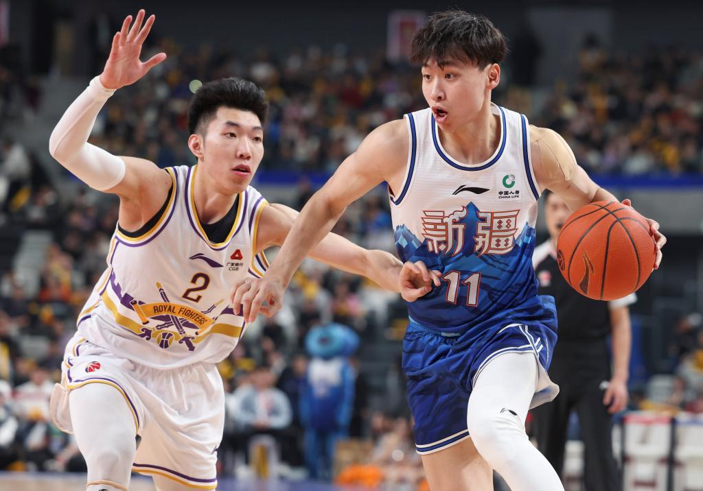3月10日,新疆隊(duì)球員齊麟(右)帶球突破北控隊(duì)球員廖三寧的防守。新華社記者 胡虎虎 攝