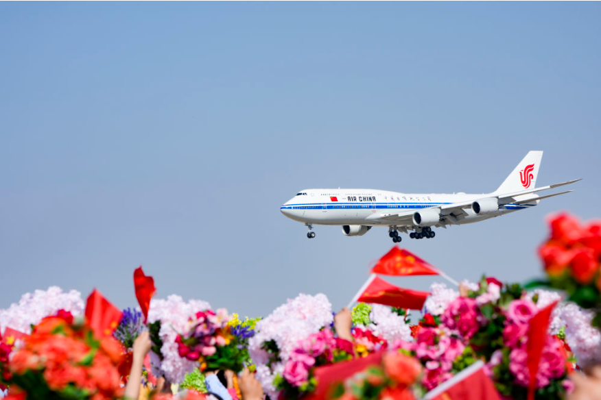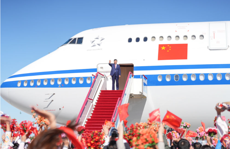 習近平總書記走出艙門,向歡迎群眾揮手致意。